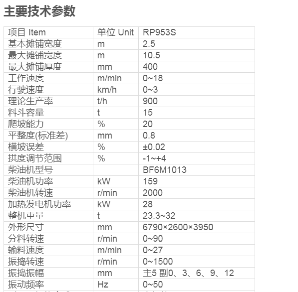 RP953S型瀝青混凝土攤鋪機(jī)是根據(jù)市場(chǎng)需求而決定開(kāi)發(fā)的一種大型攤鋪機(jī),與目前國(guó)際******的德國(guó)VOGELE S1880-3為同一技術(shù)檔次產(chǎn)品,在部分技術(shù)上處于領(lǐng)先地位,該產(chǎn)品主要適用于攤鋪瀝青混凝土面層,也可攤鋪二灰土、二灰碎石等基層材料,其****攤鋪寬度可達(dá)10.5米,是高等級(jí)公路建設(shè)中重要的施工設(shè)備。